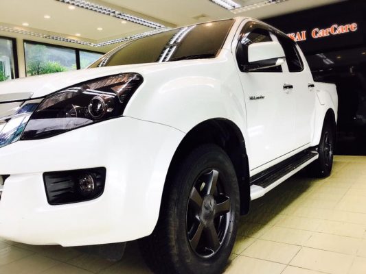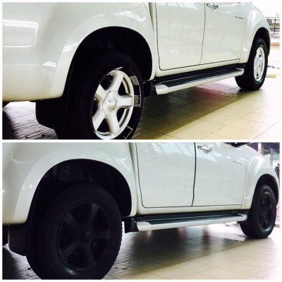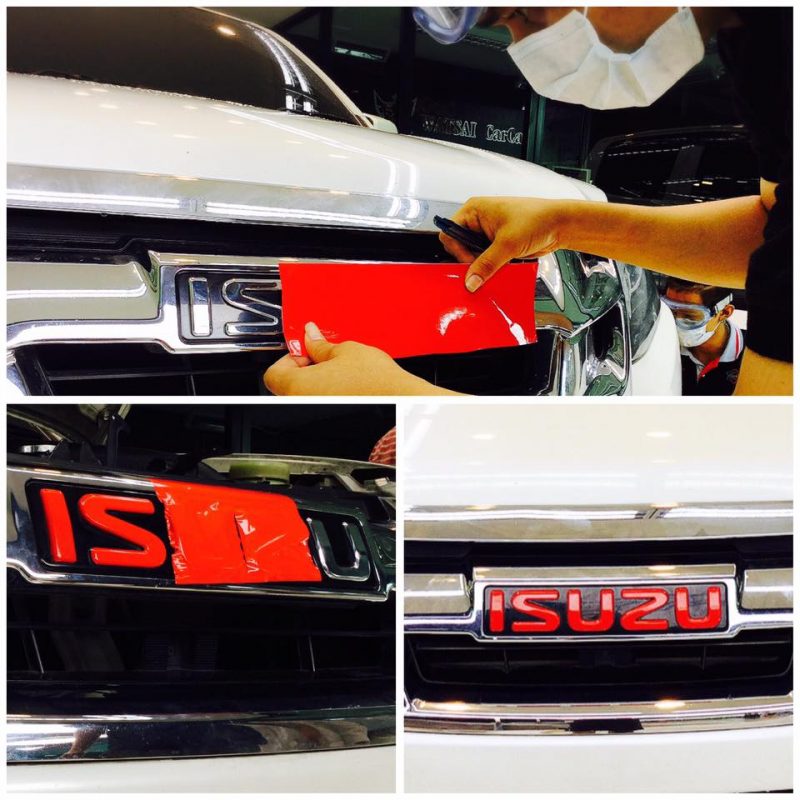 ส่งงาน Isuzu D-max กับงาน Wrap car ตกแต่งชิ้นส่วนต่างๆ ติดฟิล์มสีแดงที่ตัวอักษร ติดฟิล์มใสสีดำอ่อนที่โคมไฟหน้า-ไฟตัดหมอก เปลี่ยนสีล้อจากล้อเดิมๆให้เป็นสีดำด้าน ด้วยสเปรย์สีลอกได้ อยากเปลี่ยนสีล้อแม็กอีกเมื่อไรก็แค่ลอกออกไม่ทำลายพื้นผิว แค่นี้ก็เป็นรถคันใหม่บ่งบอกความมีสไตล์ในตัวคุณ